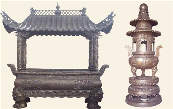 客天下产业园内客家祠堂定制的铜宝塔造型美观,古朴肃穆,铜香炉炉口高0.9-0.95米,总高3.1米,大气美观,庄重典雅。