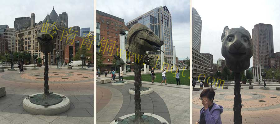 在美国波士顿街头,可以看到由广州岭南青铜公司设计制作的一群铜雕塑,包括骏马、名人铜像和一群雕塑精致、形象生动的十二生肖兽首,吸引来往行人的目光。