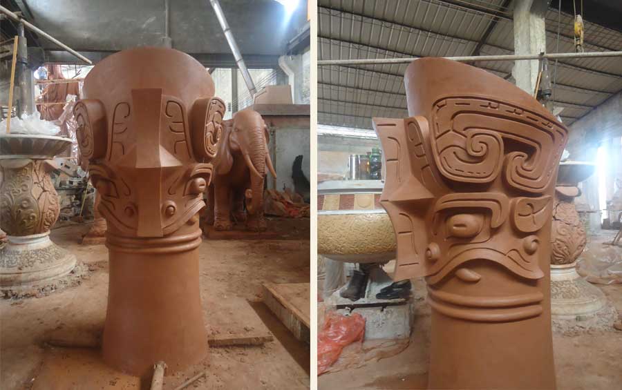 图示为风采鼎鼎足塑造泥模过程,雕刻的浮雕兽面图庄严神秘,《风采》青铜鼎设计借鉴开平风釆堂的元素,纹饰精美,造型大方。