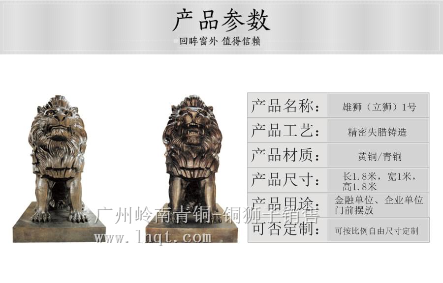 本厂是中国著名的铜狮子厂家,有40多年的银行狮子生产经验,与广发银行、招商银行、东莞银行、营口银行等多家金融单位形成长期合作伙伴,本厂生产的银行狮子以优良的品质在行业中处于领先地位,欢迎来电订购!
